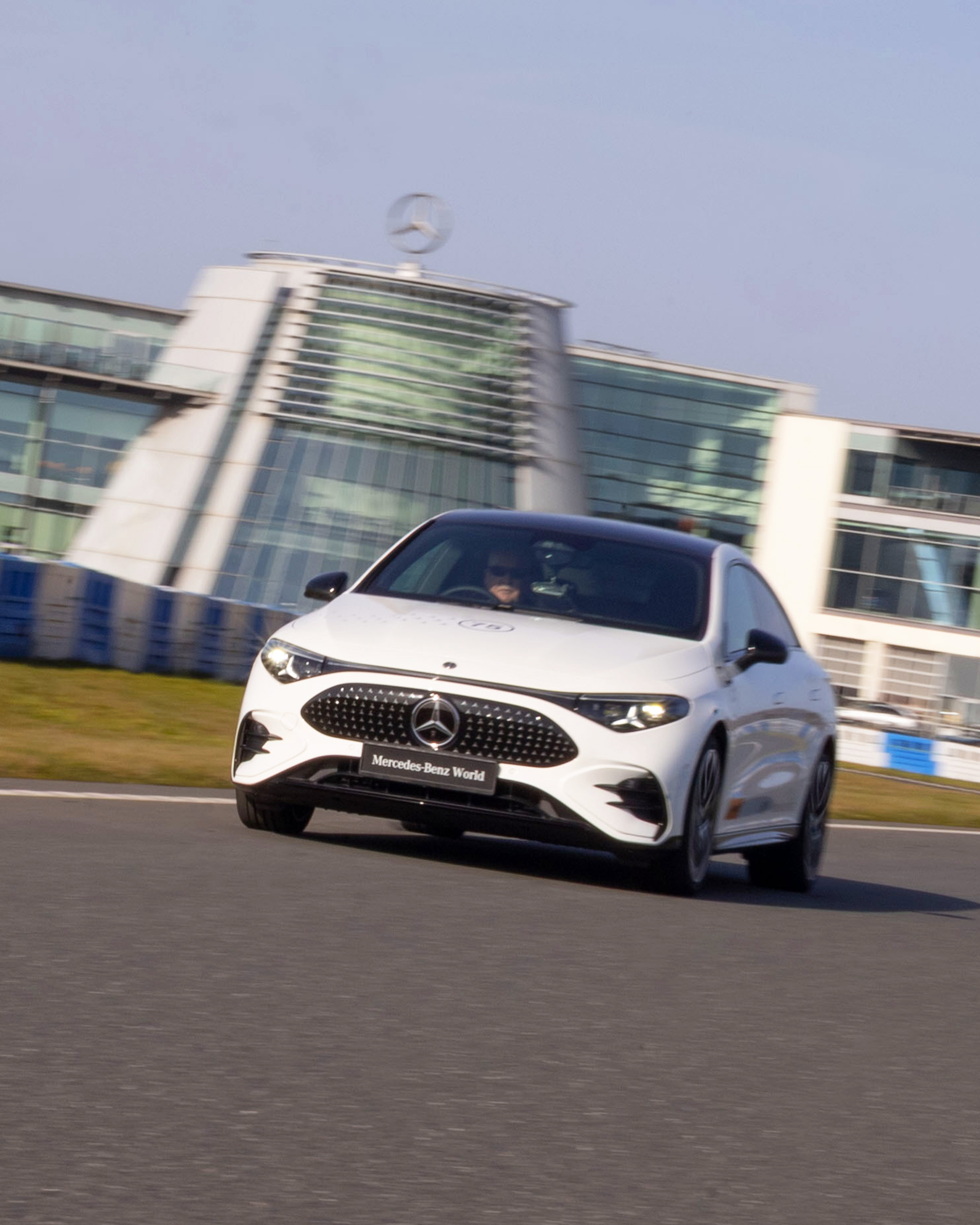 • A black Mercedes-Benz car speeds along a track outside Mercedes-Benz World, with the building's iconic glass façade and logo visible in the background.